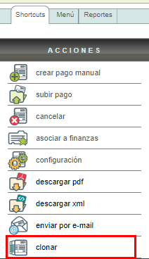Una vez dentro del comprobante, de click en la opción "Clonar" del menú Acciones que se encuentra del lado izquierdo del sistema.