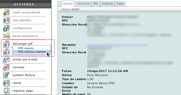 Click on the "descargar pdf" option in the "Actions" menu and immediately click on the "CFDI_impreso_logo" report.