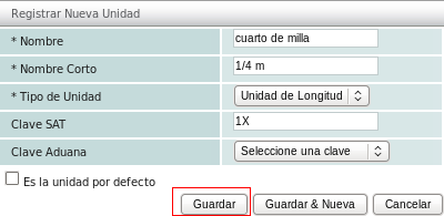 Para registrar la nueva unidad deberá registrar como mínimo el "Nombre", "Nombre Corto", y "Tipo de Unidad". Una vez listo dé click en el botón "Guardar" para finalizar esta acción.