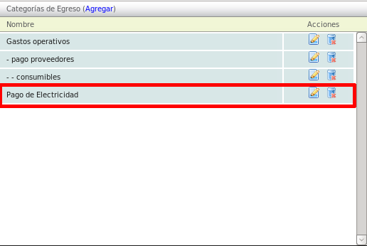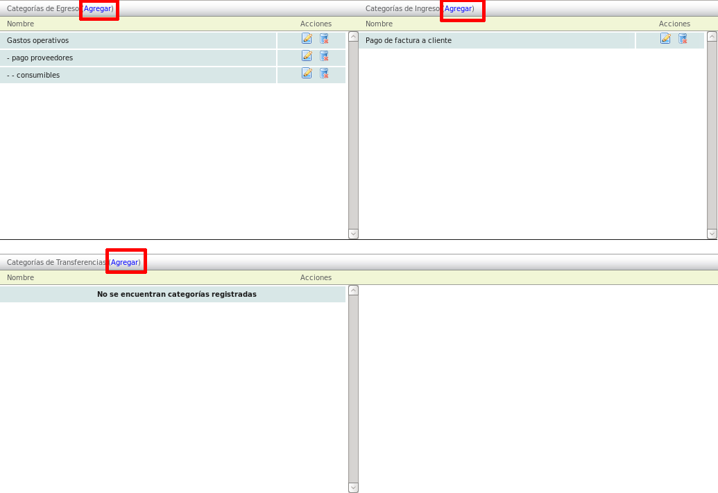 Se mostrarán las categorías para cada tipo de movimiento. Dé click en la opción, en azul, Agregar, del movimiento al cual usted desee agregar la nueva categoría.