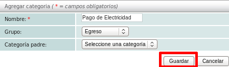 Especifique un nombre para su categoría, después verifique que esta categoría esté destinada al grupo correcto y si tiene una categoría superior. Después dé click en el botón "Guardar".
