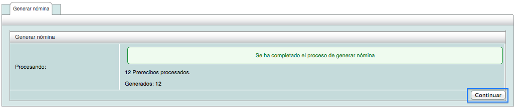 Al dar click el sistema iniciará con la generación de los prerecibos de nómina, así mismo le mostrará un resumen de los comprobantes generados. Dé click en "Continuar".