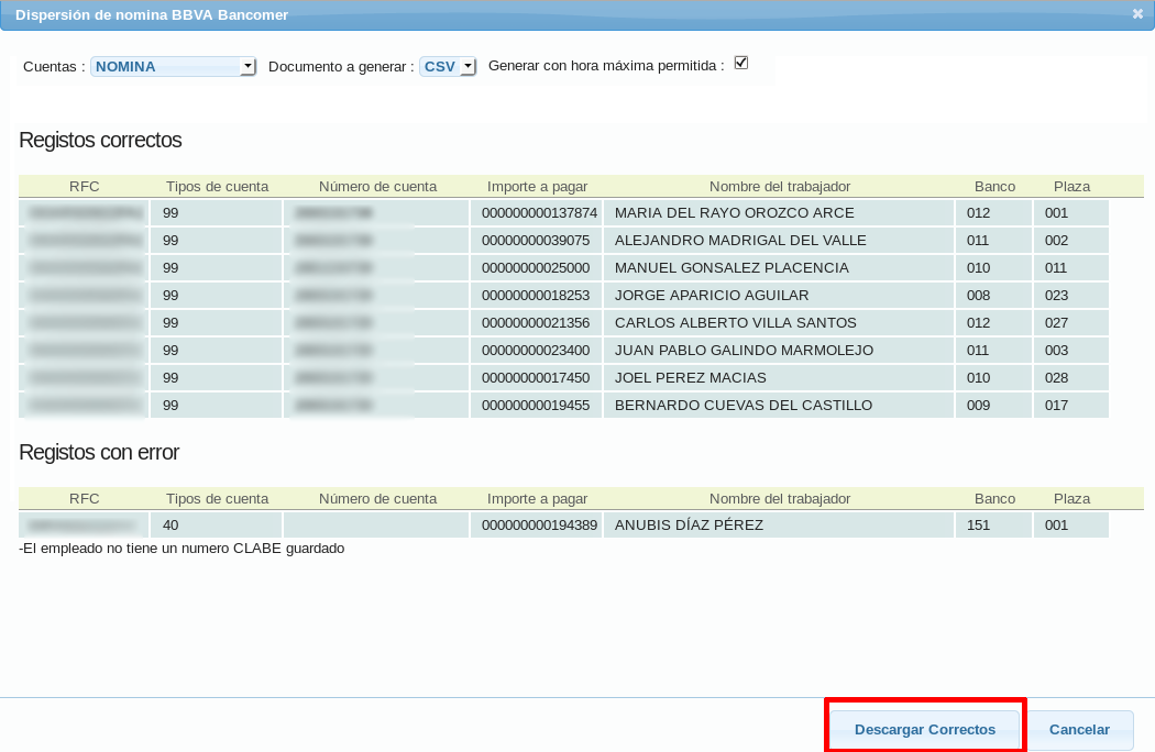 Se mostrará una ventana que mostrará a los empleados de la nómina a dispersar, y si alguno mostró un error.