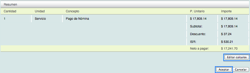 Finalmente, de click en el botón "Calcular pago" para continuar. La información del cálculo se visualizará en la parte baja de la pantalla, si desea modificar algún dato, de click en el botón "Editar cálculos".