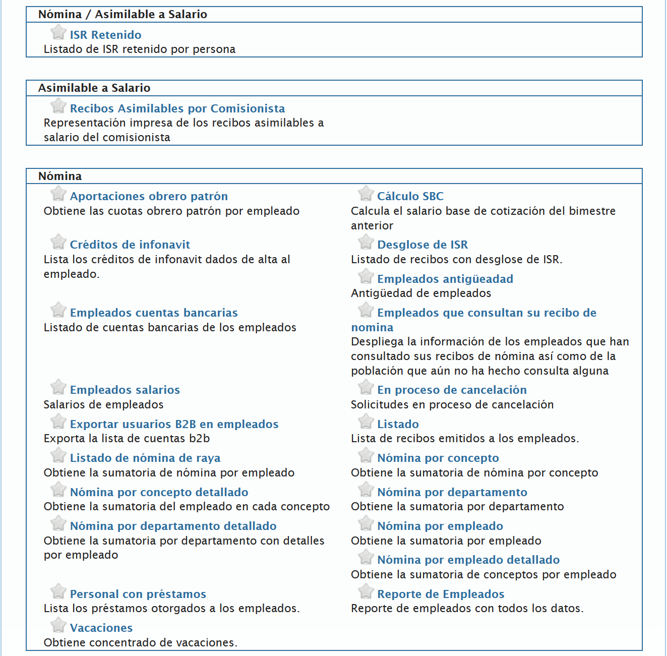 El sistema tiene un amplio catálogo de reportes de nómina a su disposición. A continuación se muestra una lista de todos los reportes disponibles:
