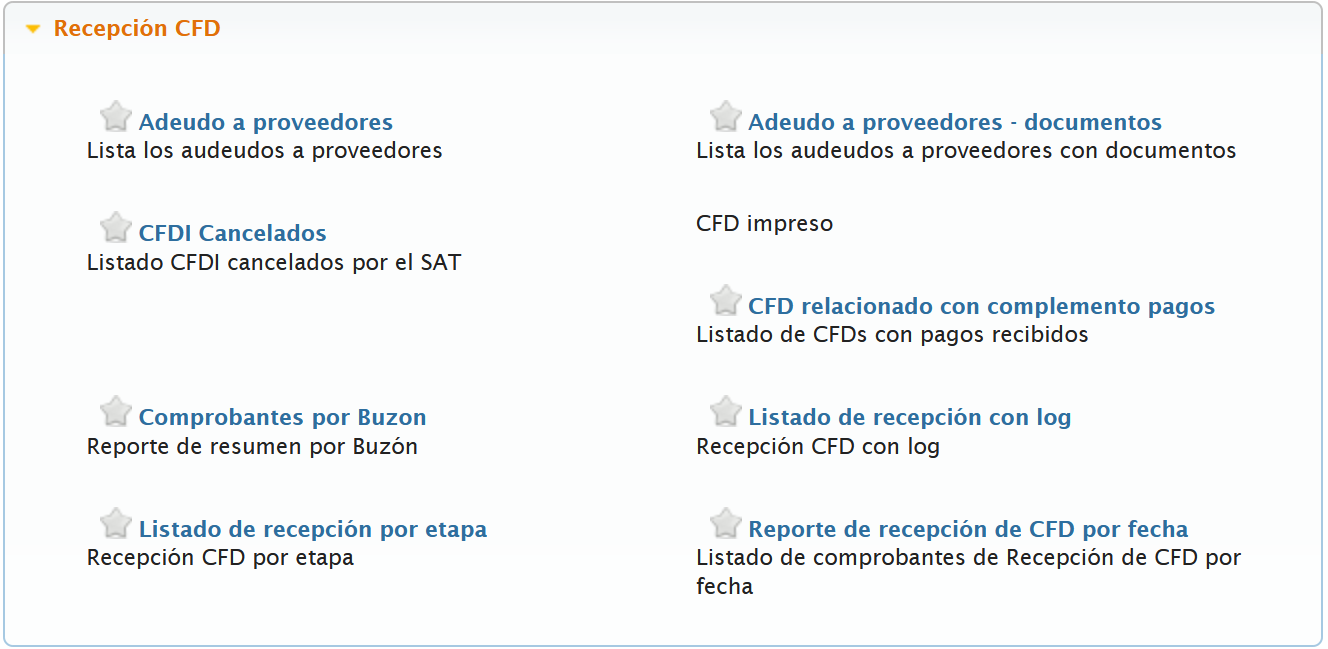 El sistema tiene un amplio catálogo de reportes de recepción CFD a su disposición. A continuación se muestra una lista de todos los reportes disponibles: