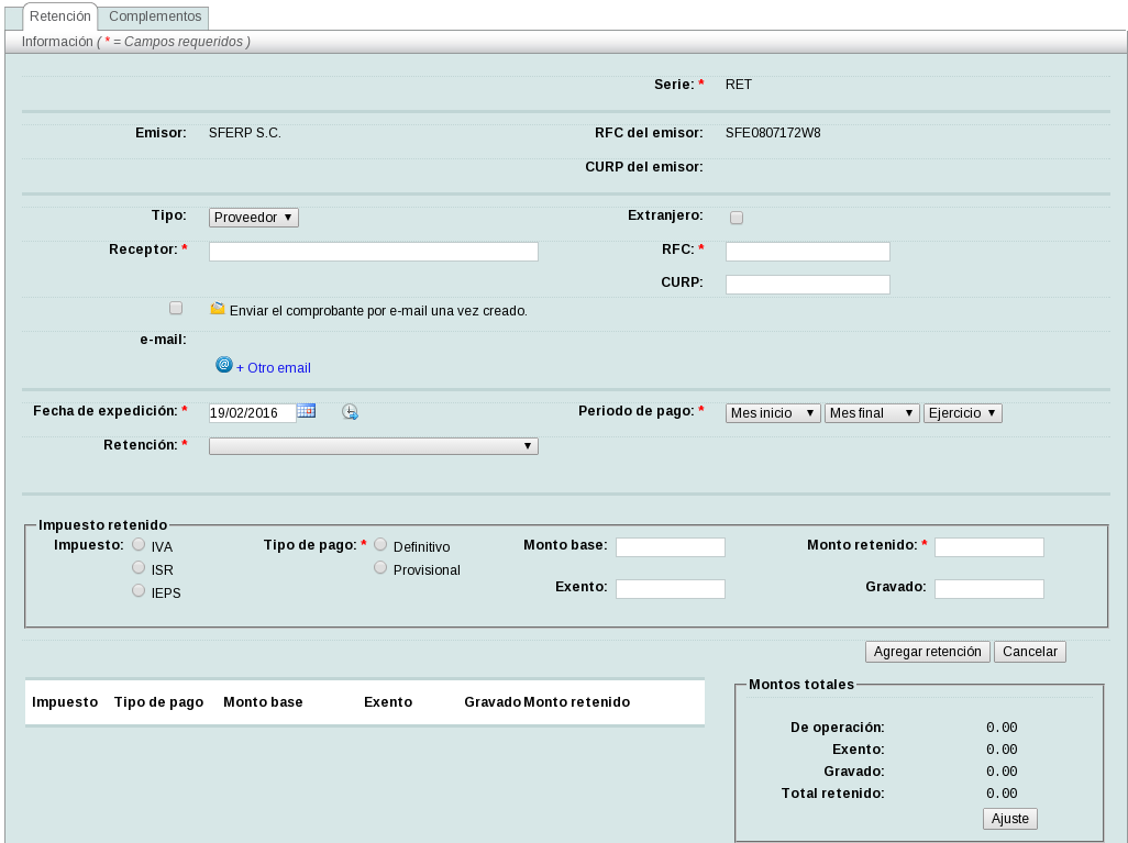 Es importante mencionarle que dependiendo del giro de su empresa, usted puede estar obligado a incluir en el CFDI de retenciones alguno de los complementos definidos por el SAT, nuestro servicio está preparado para incluir todos los complementos vigentes establecidos. Le recomendamos consultar con su contador, si usted tiene que agregar alguno de ellos.