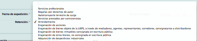 A continuación deberá seleccionar el tipo de retención de la constancia en cuestión, para realizar esta acción, dé click en el botón y seleccione de la lista la opción adecuada.