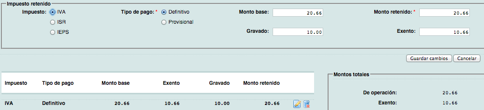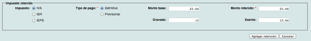 Al dar click en el botón "Agregar retención" la información se visualizará en la parte baja de la pantalla, si desea agregar más impuestos siga el proceso antes descrito.