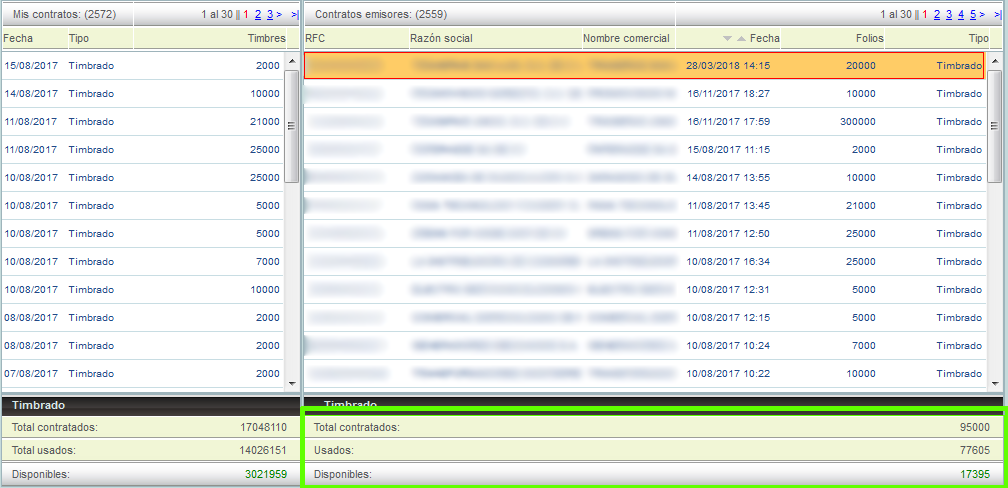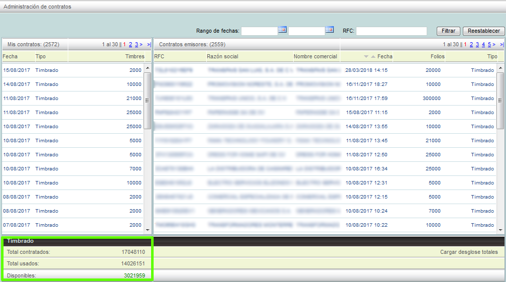 Se mostrarán los contratos de cada emisor y en la esquina inferior izquierda de la ventana podrá ver el total de timbres contratados, los usados y disponibles.