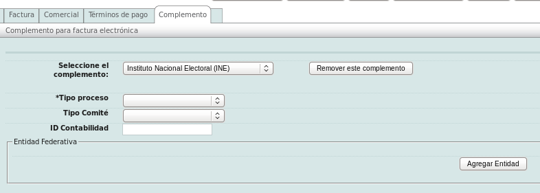 A continuación dé click y seleccione de la lista el complemento "Instituto Nacional Electoral (INE)".