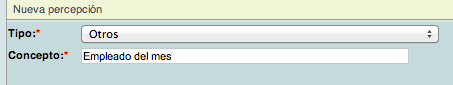 Si la percepción que desea agregar no se encuentra registrada en el catálogo “Tipo”, puede seleccionar la opción “Otros” e ingresar la percepción que necesite.