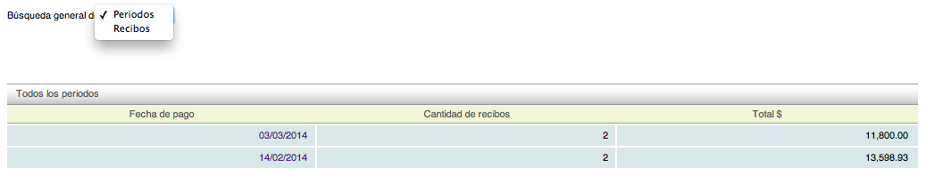El sistema de nóminas de Solución Factible® le permite filtrar los recibos realizados ya sea por “Periodos” o “Recibos” de este modo usted tendrá el control de cada recibo expedido. Para hacer uso del filtro dé click en el apartado “Búsqueda general de” donde encontrará información general como la fecha de pago, cantidad de recibos generados en dicha fecha y total del periodo.
