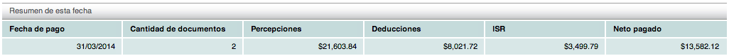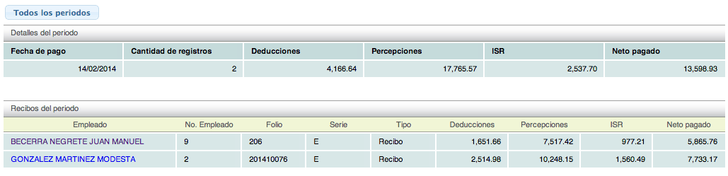Al dar click sobre el periodo, el sistema le mostrará los recibos generados en dicho periodo, así mismo podrá observar el resumen del mismo.
