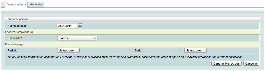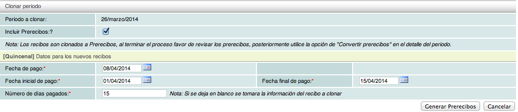 Al seleccionar esta opción tan sólo tendrá que especificar la fecha y periodo de pago para generar los prerecibos.