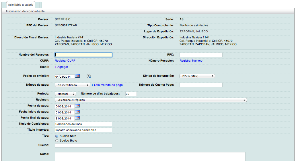 En seguida visualizará el formulario para la creación del comprobante, es importante que cuente con toda la información necesaria, al igual que en la generación del recibo de nómina, previamente tendrá que registrar al "empleado/comisionista" en el sistema, si cuenta con alguna duda vea el tema “Crear Empleado”