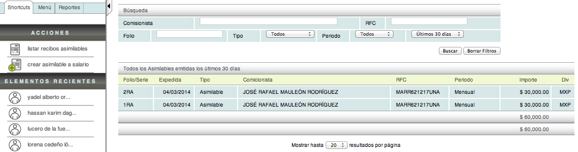 En este módulo encontrará los recibos asimilables generados previamente, así mismo cuenta con un panel de búsqueda que le permitirá realizar búsquedas por empleado, periodo o RFC.