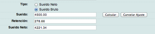 Cuenta con dos opciones para ingresar el sueldo del empleado, si es “Sueldo Neto” tan sólo ingrese la cantidad a pagar, para el caso de “Sueldo Bruto” active la casilla e ingrese la cantidad a pagar, en seguida dé click sobre el botón “Calcular”, de este modo el sistema realizará el cálculo de los impuestos.