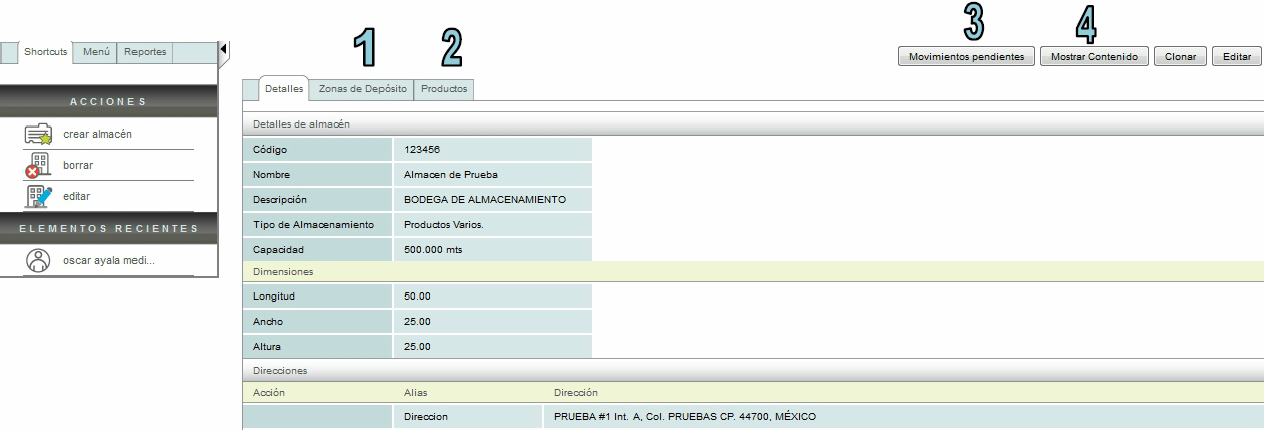 Una vez creado el almacén usted podrá realizar varias acciones, dentro del menú "Acciones" podrá "Borrar" o "Editar" el almacén, así mismo encontrará acciones que detallaremos a continuación.
