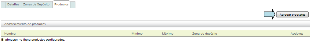 En esta sección usted podrá ingresar todos los productos registrados en su base de datos al almacén creado, para esto es necesario que ingrese a la pestaña "Productos" y dé click sobre el botón "Agregar Productos".
