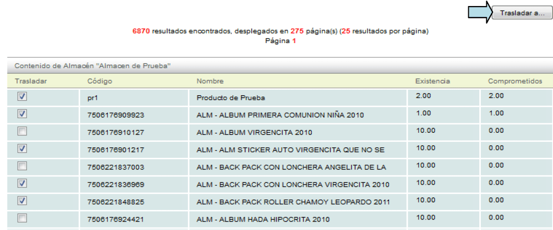 Cuando termine, dé click en el botón "Trasladar a..." para seleccionar el almacén destino y la cantidad de productos a trasladar.