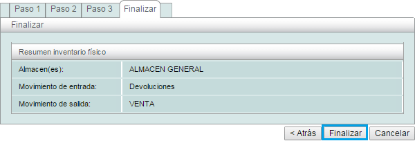Finalizar: le mostrará el resumen del inventario físico, para finalizar presione el botón de finalizar.