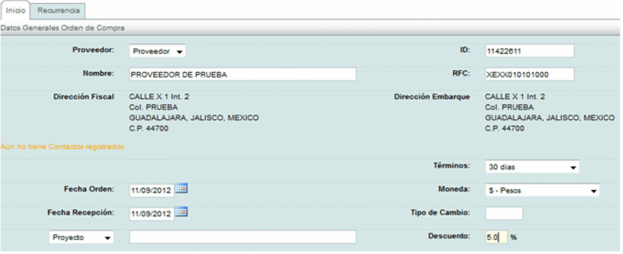 En la primera sección deberá ingresar el nombre del proveedor, así como establecer los términos y condiciones de la compra.