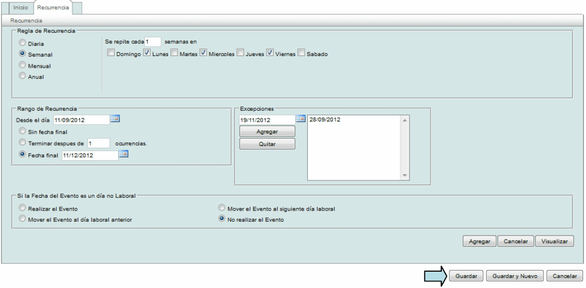 - Rango de fechas en la recurrencia. (puede elegir la fecha inicial y final de la recurrencia).