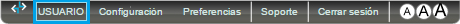 En la parte superior derecha de la pantalla aparecen el nombre del usuario en uso de la aplicación y las opciones de configuración para la misma.
