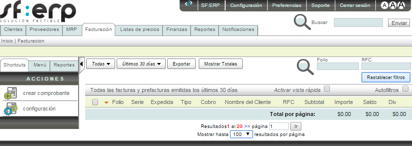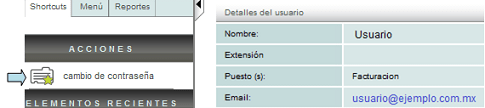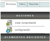 Del lado izquierdo, por debajo del panel principal encontrará los accesos rápidos de la aplicación (Shortcuts). Este menú tiene por nombre "Acciones" y es un menú contextual, esto significa que dicho menú cambiará en sus opciones dependiendo del módulo en el cual se encuentre.