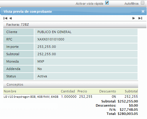 Esta casilla le permite ver la información básica de cualquier factura al pasar el cursor por encima del renglón de su comprobante.