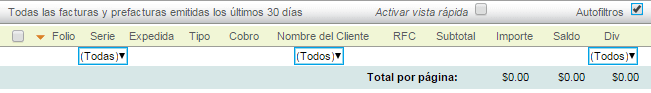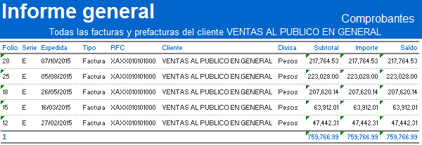 Reporte facturas: le generará un reporte con los campos: Folio, Serie, Expedida, Tipo, RFC, Cliente, Divisa, Subtotal, Importe y Saldo.