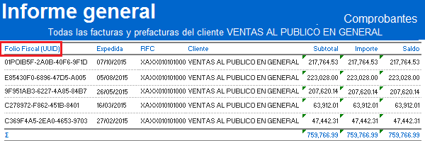 Reporte facturas con UUID: Le generará un reporte con los campos: Folio Fiscal (UUID), Expedida, Tipo, RFC, Cliente, Divisa, Subtotal, Importe y Saldo.