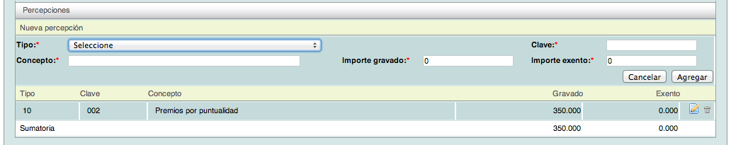 Cuando termine de agregar sus percepciones podrá observar el resumen de las mismas y su sumatoria.