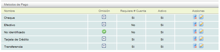 Para editar o eliminar algún método de pago, debe dar click sobre el ícono deseado de la columna "Acciones".