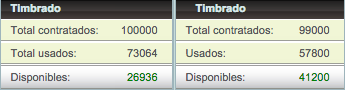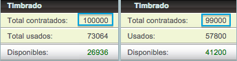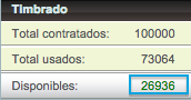 De acuerdo con la imagen anterior, entendemos que la parte izquierda muestra el resumen de los timbres que usted a contratado con Solución Factible®, por lo que en este ejemplo se han contratado un total de 100,000 folios de los cuales se han utilizado un total de 73,064 y restan por utilizar un total de 26,936.