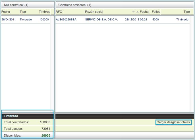 En esta sección usted podrá controlar el consumo de timbres de sus emisores. La ventana se divide en dos secciones, el lado izquierdo le presenta todos aquellos contratos que usted a adquirido con Solución Factible® y el lado derecho, los contratos que usted a realizado a sus emisores.