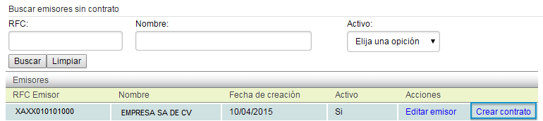 El sistema le mostrará los emisores que no cuentan con un contrato asignado, puede utilizar los filtros de búsqueda para agilizar el proceso.