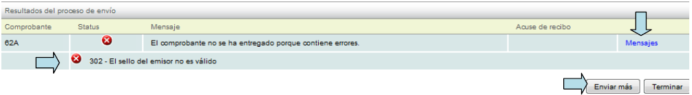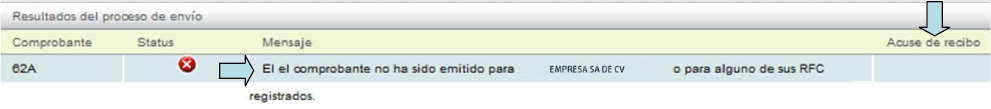 Si él o los comprobantes no son válidos, el sistema le notificará y NO le otorgará el acuse de recibo, en este caso le indicará la razón por la que el comprobante fue rechazado.