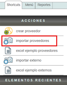 Luego, localice el menú "Acciones" del lado izquierdo, seleccione la opción "Importar proveedores".