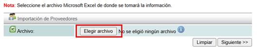 Elija el archivo excel que contenga los proveedores a importar y presione "Siguiente".