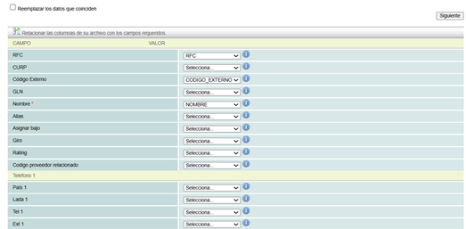 Tras esa operación, el sistema proveerá campos para el formulario del ERP, por lo que es necesario seleccionar manualmente cada campo para que coincida con la descripción del excel. Los campos marcados con asterisco (*) son obligatorios. Al finalizar, de click en "Siguiente".